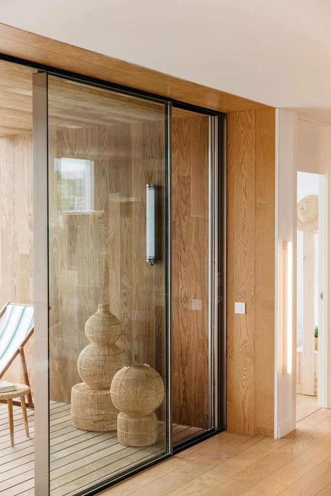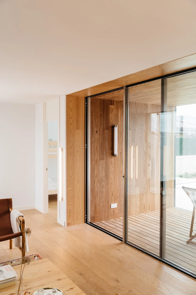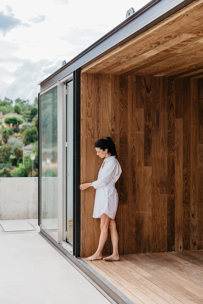El porche, por ejemplo, está forrado de madera termotratada para aumentar su resistencia y durabilidad, en color caramelo.