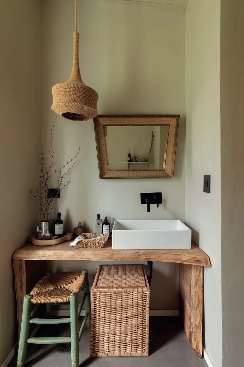 Junto a la puerta de dos hojas, llama la atención un mueble tipo vitrina, sillas Windsor de madera compradas en un remate y canastos del puerto de frutos.