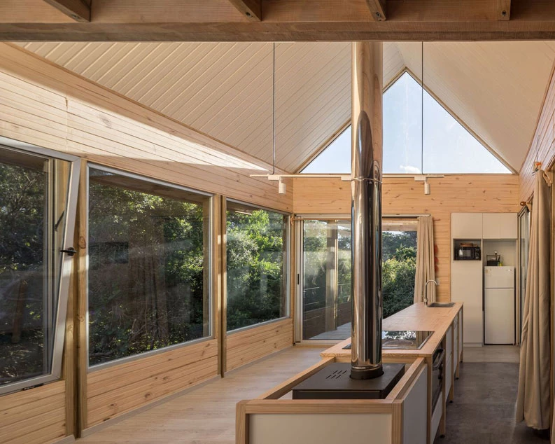 Este refugio se articula en una disposición longitudinal que divide el terreno en dos instancias de características diferentes: la primera orientada al norte se relaciona en una lógica física, de acceso y vínculo interior exterior de uso; y la segunda orientada al sur se relaciona en función de una lógica de contemplación, para mirar el paisaje a partir de una serie de recortes específicos en la cascara y cubierta.