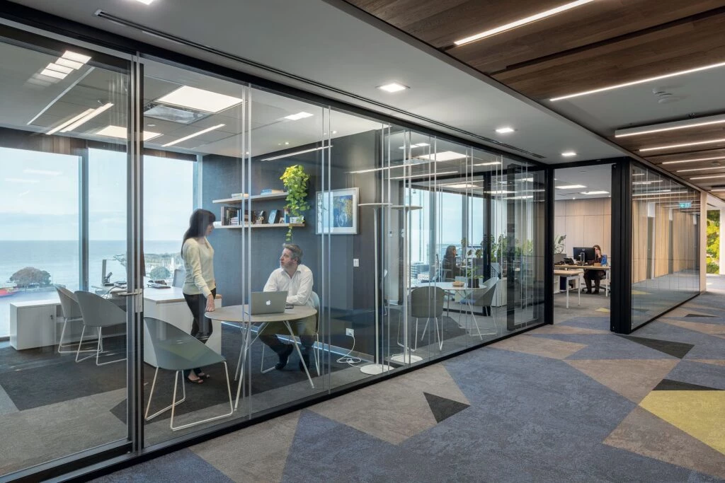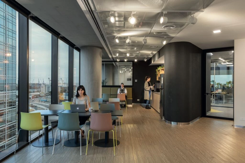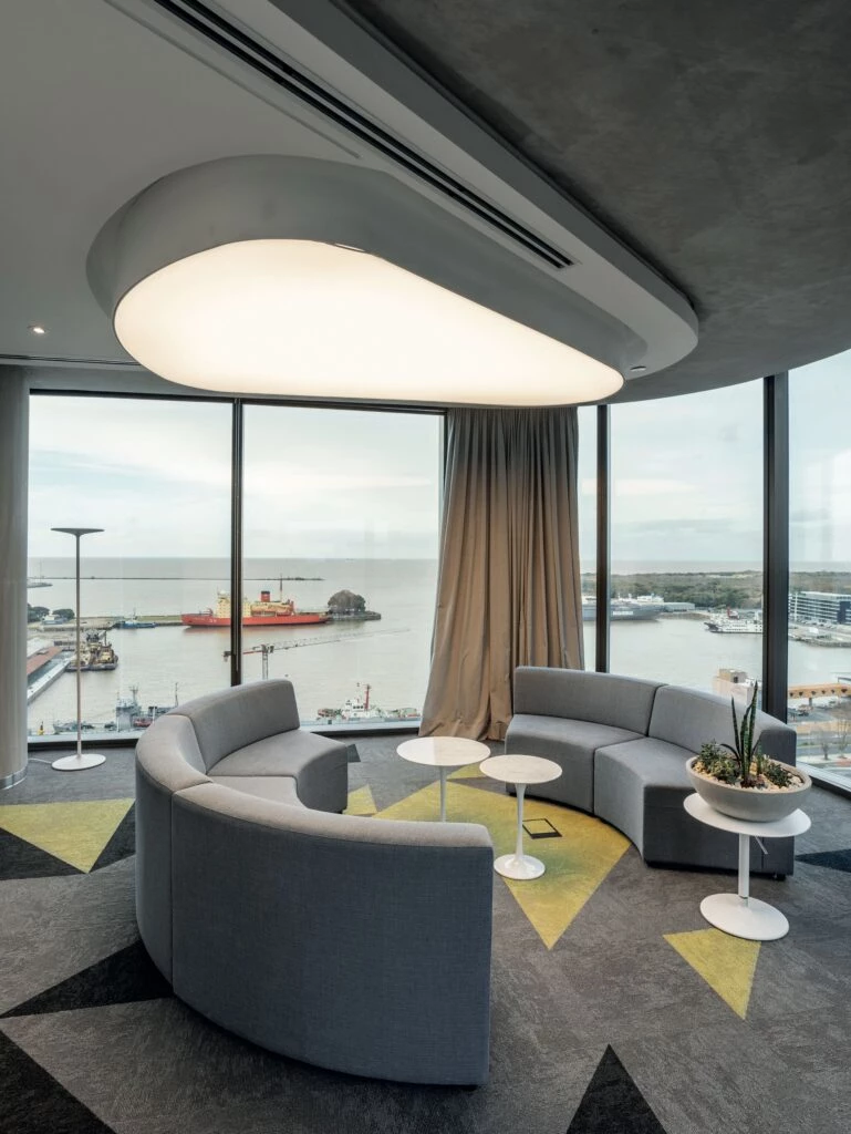 Con muebles (Interieur Forma) y alfombra (La Europea) una de las oficinas suma la tecnología audiovisual de última generación, implementada también por Contract Workplaces, y despliega criterios de diseño sustentable tales como la integración de vegetación para reforzar la biofilia en los separadores en las estaciones de trabajo y el muro verde, y la implementación de tecnologías orientadas a la eficiencia energética y al cuidado del medio ambiente, tanto en el proceso de obra como en la operación diaria.