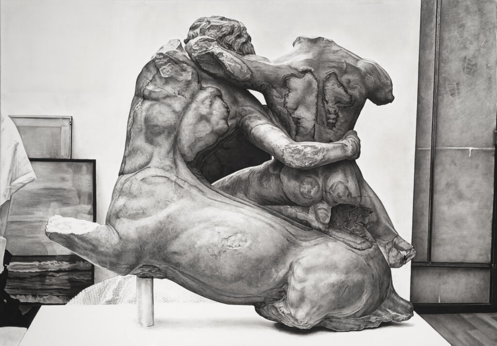 En paralelo, carbonillas de gran tamaño representan y exhiben otros cuerpos y permiten encontrar los hilos de una trama en la que -desde lo simbólico- los modelos institucionales que han marcado nuestra historia inciden y determinan el plano de lo identitario.