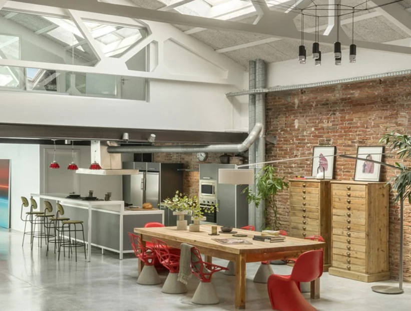 La arquitectura a la vista sigue siendo uno de los pilares básicos del estilo industrial en todas sus variantes. Paredes de ladrillo, columnas de hierro u hormigón, tuberías y vigas en el techo, quedan al desnudo.