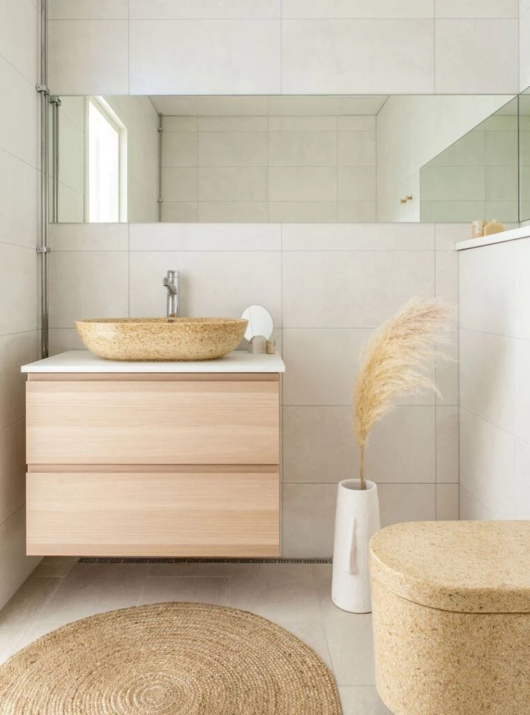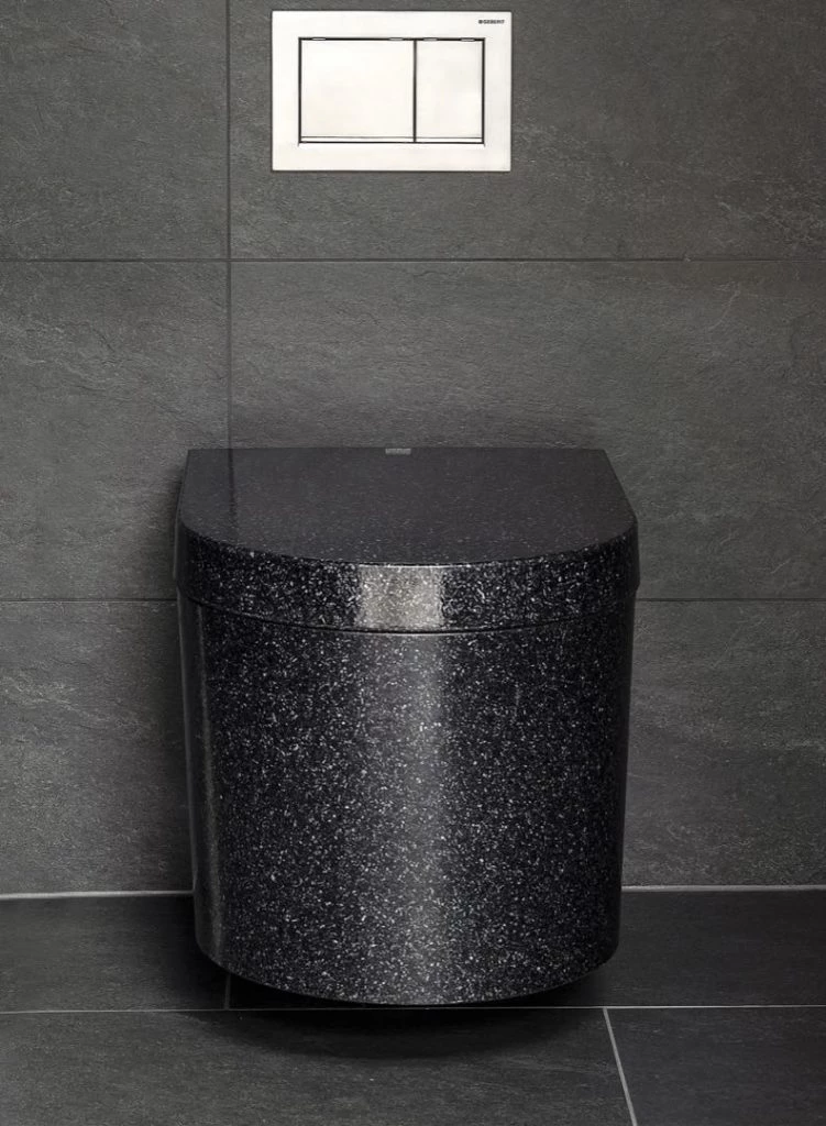 Tanto como para el asiento y el inodoro, se usó el compuesto de madera, un material sostenible que produce un 99 % menos de emisiones en su producción que la cerámica. Así es Block.