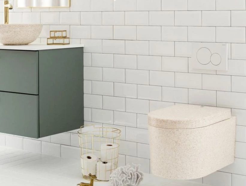 Tanto como para el asiento y el inodoro, se usó el compuesto de madera, un material sostenible que produce un 99 % menos de emisiones en su producción que la cerámica. Así es Block.
