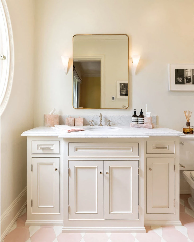 El dormitorio que comparten los artistas tiene un baño en suite con bañera exenta y ducha a vapor. Las mesadas de mármol dan la nota en este ambiente y se combina a la perfección con el piso con detalles en color blanco y rosa. ¡Divino!