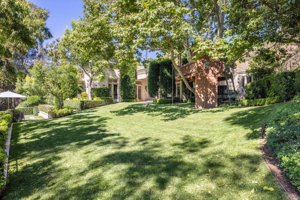 Una delicada casa en el árbol y una mega piscina de borde infinito con spa complementan los exteriores de la casa de los artistas.