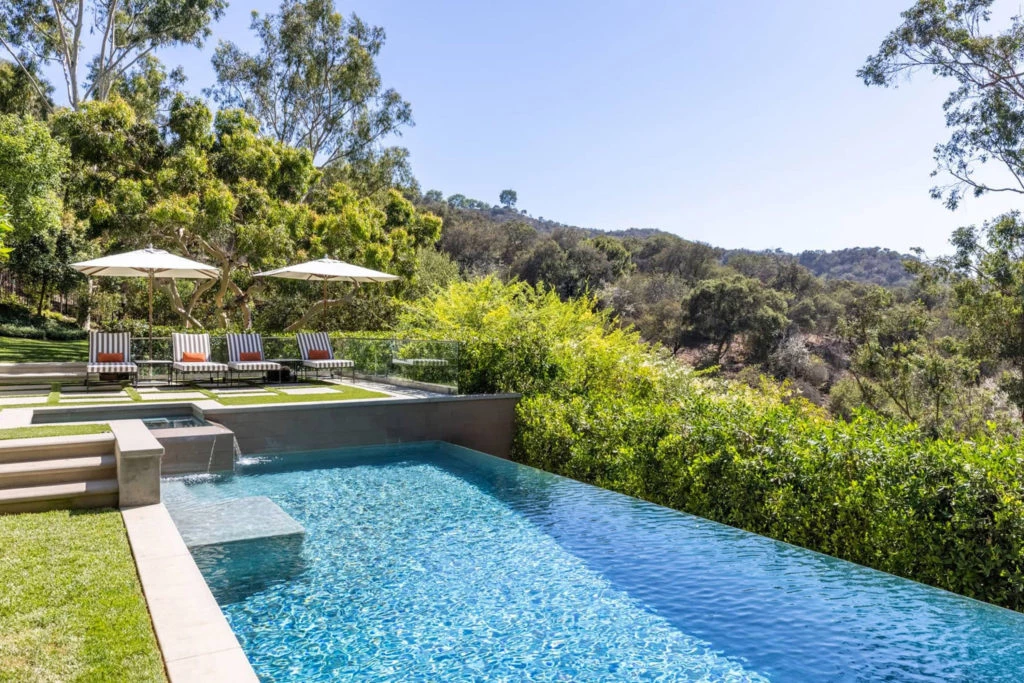 Una delicada casa en el árbol y una mega piscina de borde infinito con spa complementan los exteriores de la casa de los artistas.
