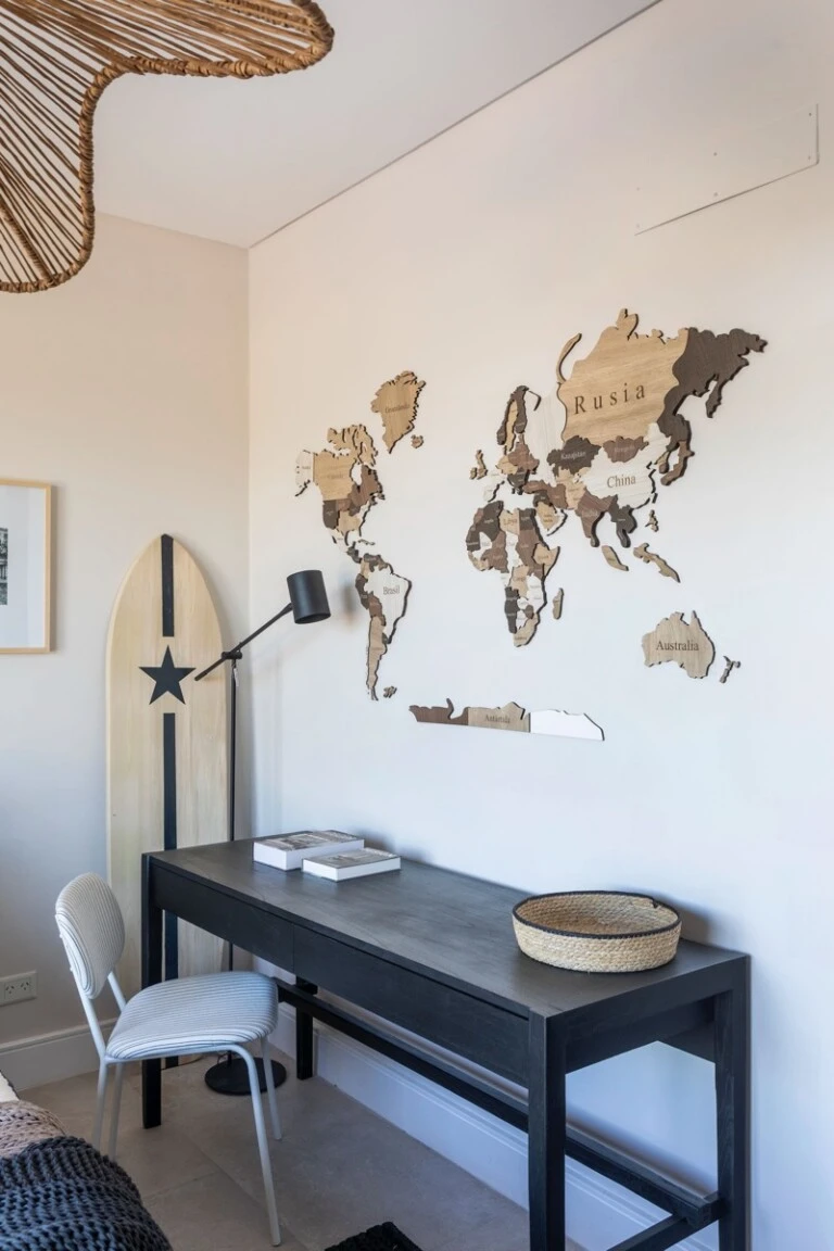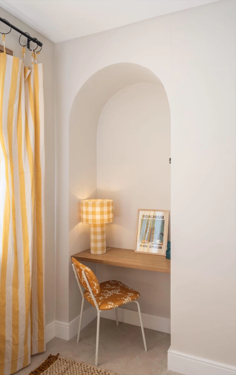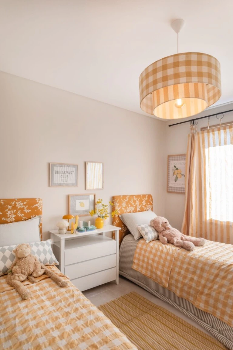 Una sala de estar joven y luminoso introduce color y un lenguaje más lúdico. Textiles gráficos, ilustraciones y materiales naturales conviven en un ambiente flexible, pensado para distintas actividades.