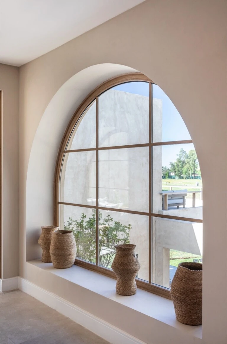 Con piso calcáreo, el patio interno introduce la materialidad del proyecto y organiza las visuales. Grandes ventanales y arcos aportan ritmo y profundidad, generando una fuerte conexión entre interior y exterior.