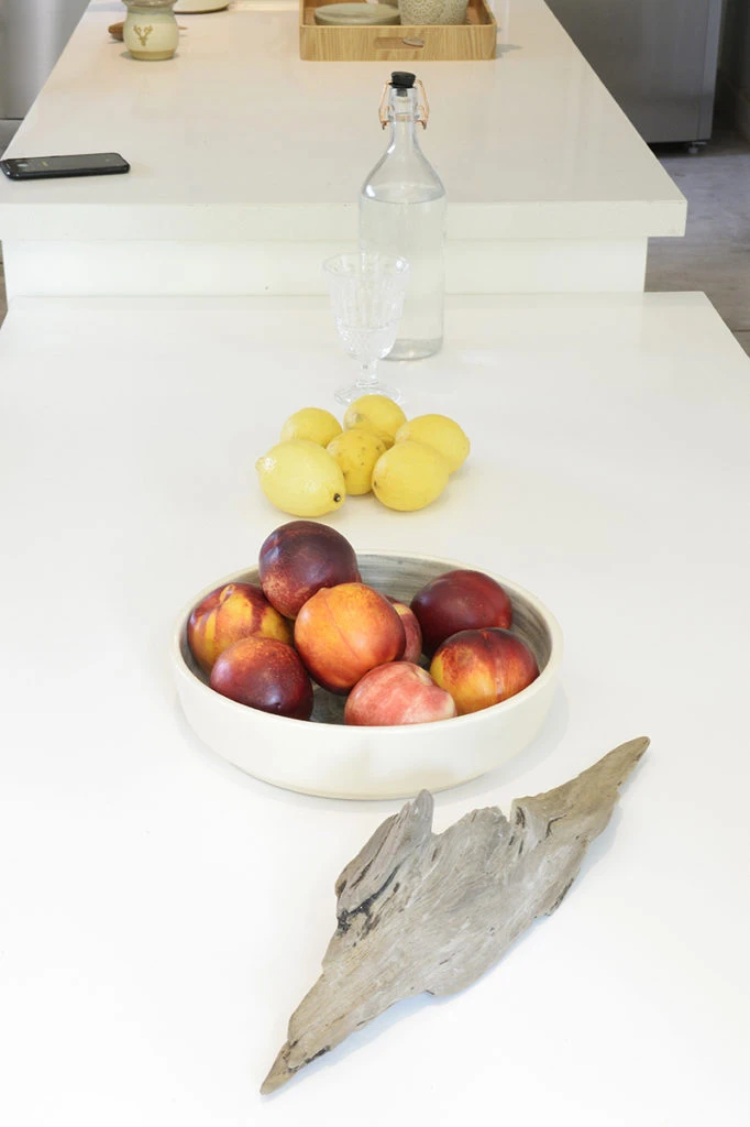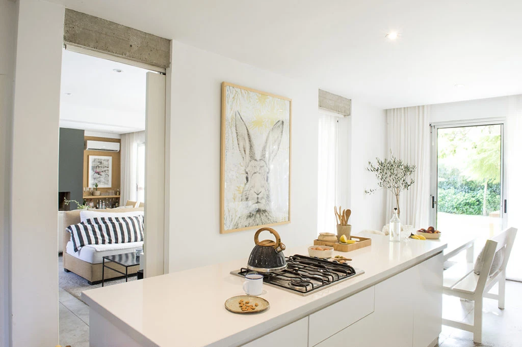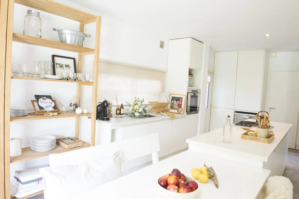 Apenas ingresamos a ella, enamora por su extrema luminosidad y su propuesta de estilo: el mix de blanco total con detalles de madera y fibras naturales.
