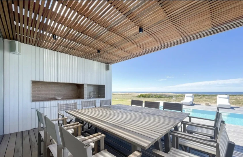 La galería techada con pérgola de madera funciona como una verdadera extensión del living. Sofás amplios, mesas bajas y textiles neutros crean un espacio ideal para reuniones informales, mientras que la piscina lineal se recorta sobre el deck de madera y se abre visualmente hacia el mar. Las reposeras blancas refuerzan el clima de relax total, típico de José Ignacio.