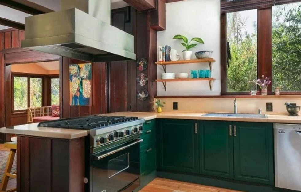 Además, tiene múltiples alacenas de colores naturales, como marrón y verde bosque, y una súper isla central con tapa de mármol blanco que funciona para cocinar y como barra desayunadora.