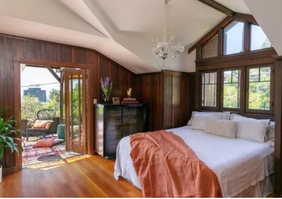 Al igual que el resto de los ambientes, el dormitorio principal derrocha calidez y estilo propio. Tiene techos irregulares pintados de blancos y paredes revestidas en madera oscura.