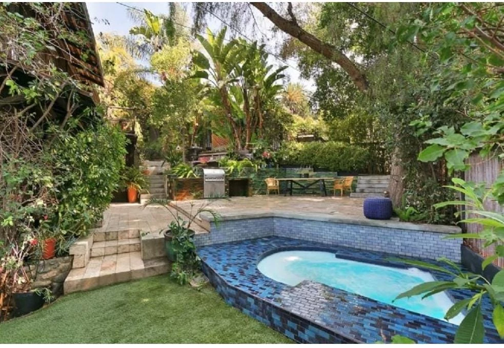 El exterior de la casa es uno de los sectores más lindos. Y es que además de estar repleto de plantas verdes y especies autóctonas, tiene una amplia terraza con vistas panorámicas de Sunset Strip, jacuzzi, fogonero, parrilla y una fabulosa piscina hecha con azulejos de diferente tonalidades de azul. ¡Mejor imposible!