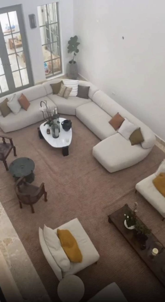 Con un rápido recorrido, Tino -como lo llaman sus seguidores- mostró la amplia y luminosa sala de estar desde un segundo piso. Allí se puede ver un gran sillón blanco en forma de U con almohadones a tono y sillas de madera, además de una amplia alfombra color tierra que cubre la totalidad del espacio aportando una dosis extra de calidez.
