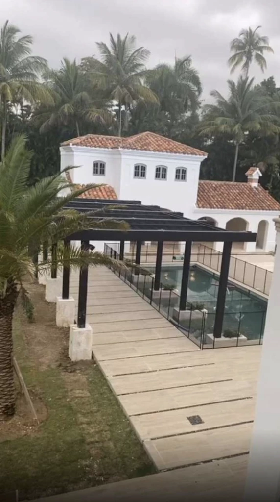 Valentino también mostró el exterior de la casa, el cual sufrió algunas modificaciones: se puede observar un lujoso jardín rodeado de palmeras, una piscina con spa, una zona con una pérgola techada y una casa para huéspedes de un gran tamaño.
