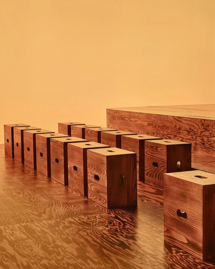 La famosa sesión, que “el Picasso de la arquitectura” diseñó en 1952 para su granero en la Riviera, se reproduce en la instalación de Bottega Veneta en un acabado especial en madera quemada, inspirado en una técnica tradicional japonesa, que revela los motivos característicos de las venas, haciendo que cada pieza sea única.