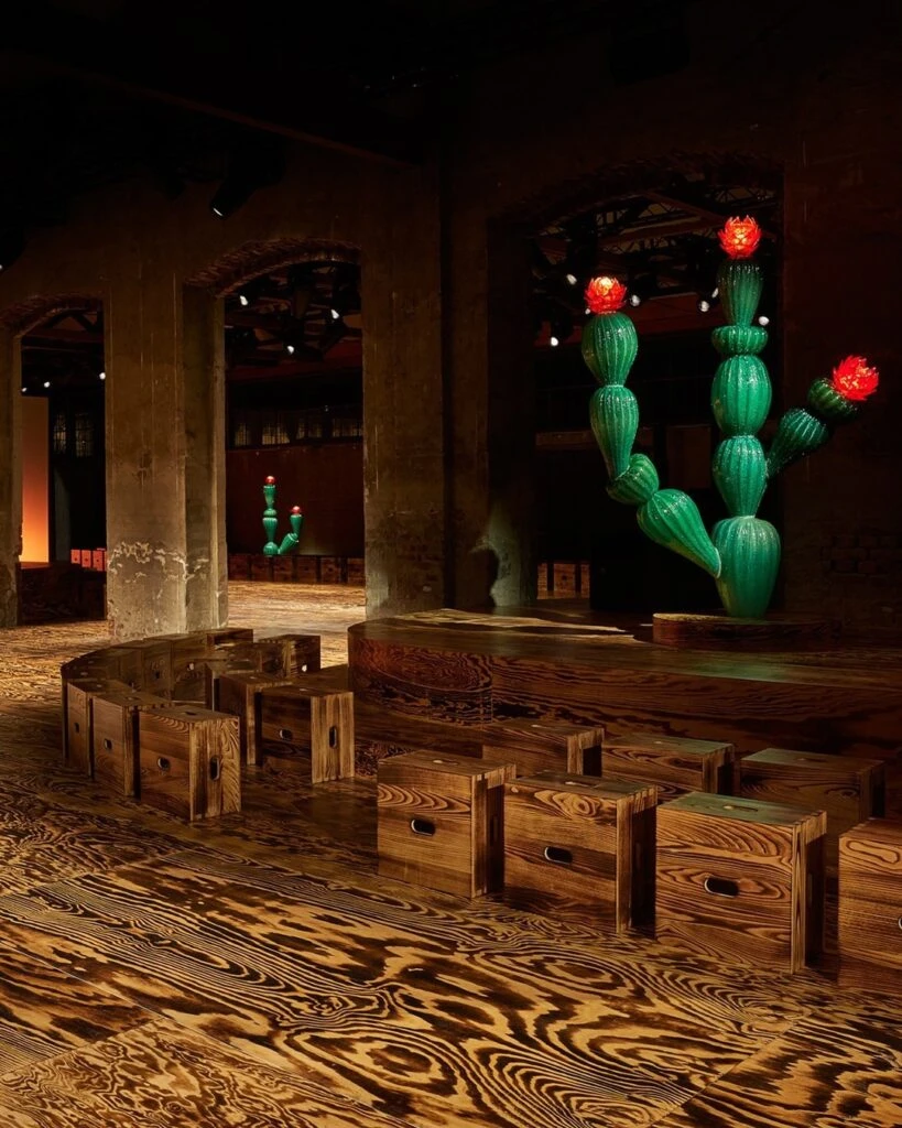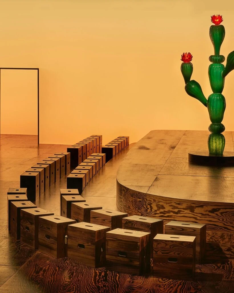 Los taburetes son actores principales en un escenario en el que, además de los cactus centinelas de cristal de Murano, se destaca las losas de parquet flameado en el suelo que potencian la sensación de velocidad y de resplandor, “de algo magnífico, como un fuego ardiente, que tiene la belleza de lo efímero y la fuerza de grabarse en la memoria, única recompensa a la que tenemos derecho en el momento”.