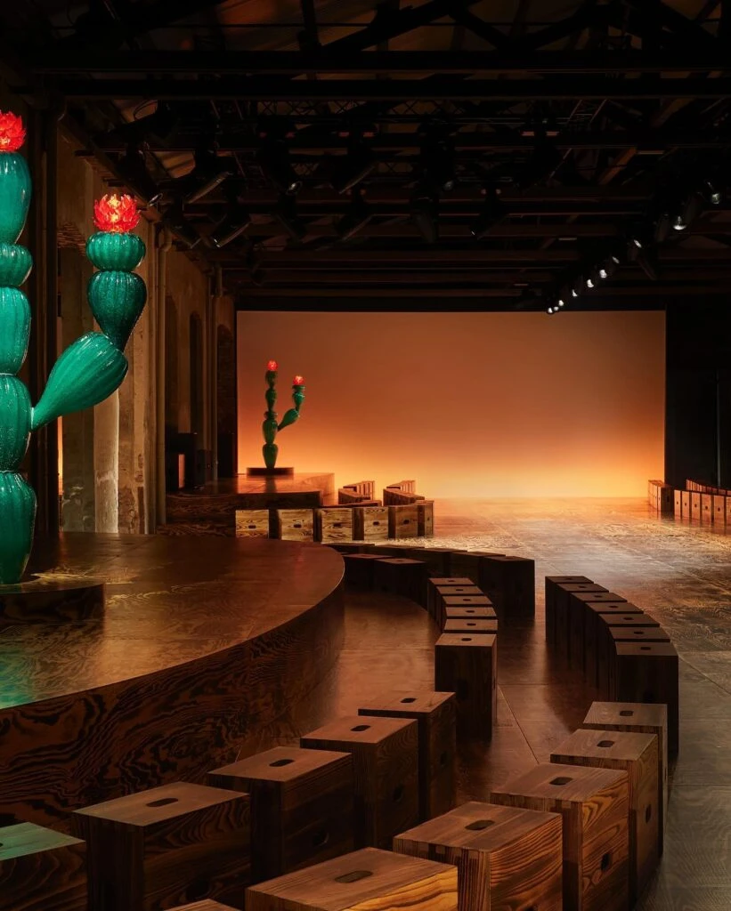 Y explicó: “Es una idea de resistencia: el cactus crece donde nada más puede. Ojalá el suelo se pareciera a este paisaje; el desfile pudiera transmitir una sensación de introspección, pero con un mensaje de resistencia y esperanza. Esta es una prueba de fuego que se supera. Los taburetes se queman a mano. Originalmente, el taburete era una caja de whisky que había encontrado y reutilizado; un objeto práctico que se ha convertido en una leyenda”.