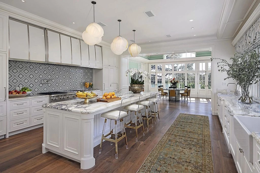 Siguiendo con el recorrido, nos encontramos con la cocina principal, la cual se caracteriza por tener una predominancia del color blanco y detalles de categoría como mármoles, electrodomésticos de alta gama y lámparas de diseño. En el centro, una fabulosa isla que también funciona como barra para comidas informales gracias a cuatro banquetas con toques dorados y transparentes.