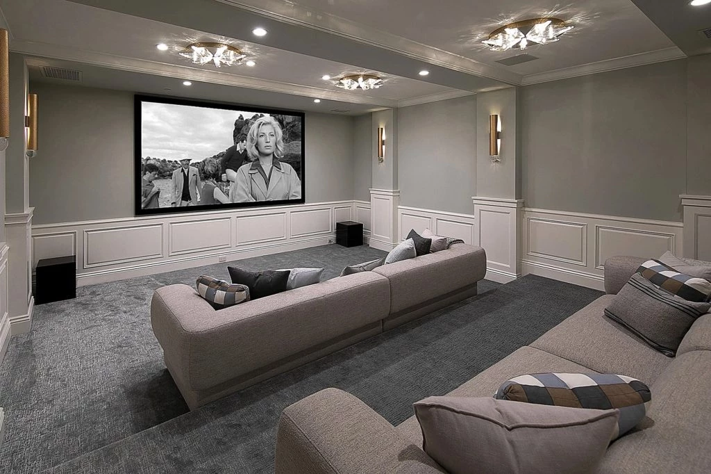 Por supuesto que en la futura casa de la pareja, no podía faltar una buena sala de cine. Pisos alfombrados y cómodos sillones XXL se hacen presentes en este espacio de lujo, ideal para disfrutar de una noche de película con amigos o en familia.