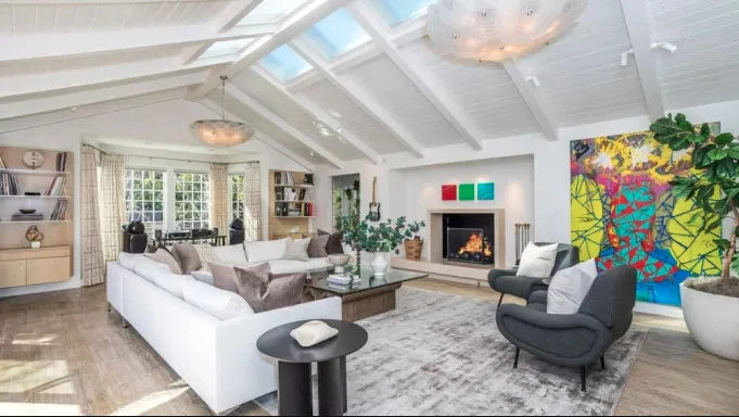 El living se destaca tanto por su gran amplitud como luminosidad, ya que cuenta con grandes ventanales y claraboyas que dejan pasar la luz natural, y por los toques de color presentes en obras de arte valuadas en millones de dólares. Este sector cuenta con un sillón en forma de L tapizado en color blanco y una chimenea súper moderna.