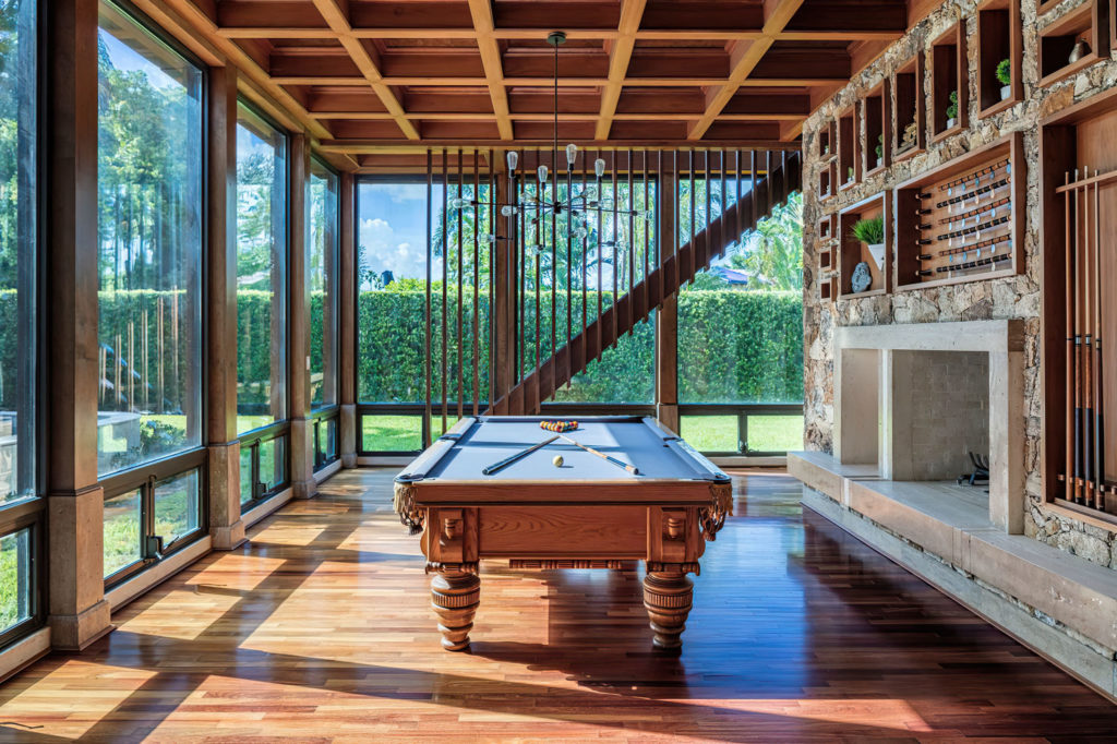 Siguiendo con el recorrido, nos encontramos una sala de juegos súper rústica. Una mesa de pool robusta se luce en el medio de este sector junto a una chimenea rodeada de piedras. Los amplios ventanales ofrecen vistas despejadas hacia los exteriores e inundan de luz el espacio.