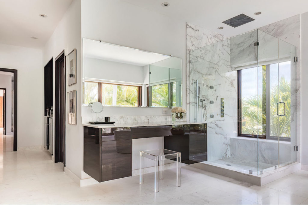 El baño en suite es súper amplio, luminoso y elegante. Cuenta con ducha a vapor, bañera, dos tocadores y tiene al mármol Calacatta como protagonista.