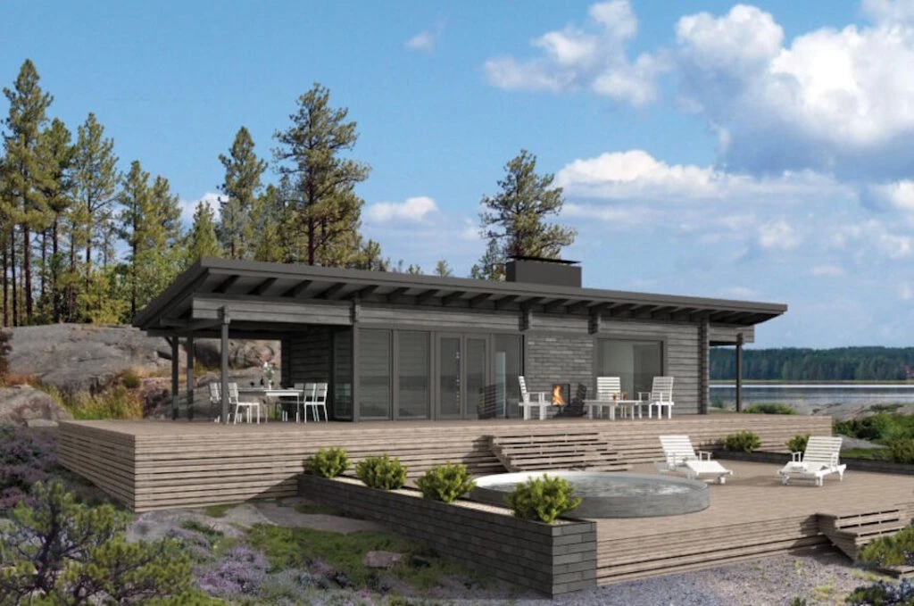 La mini casa se adapta a todas las estaciones del año e inclemencias climáticas gracias a su terraza exterior cubierta y a su sauna finlandesa.