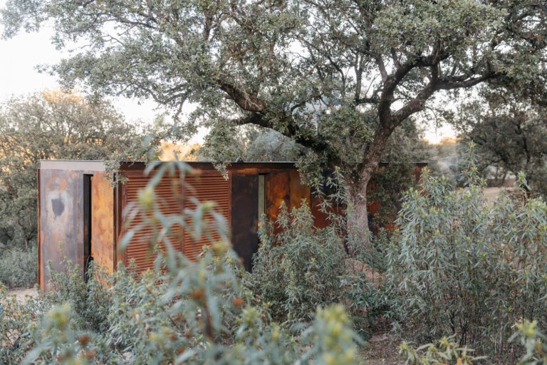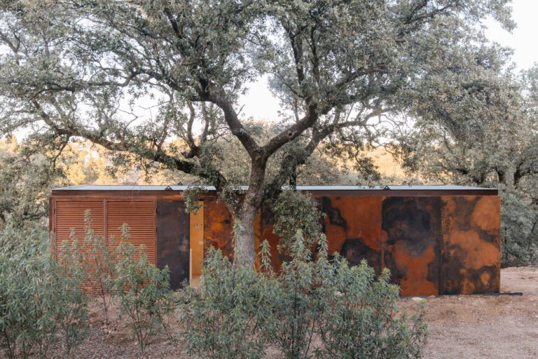 En esta misma linea, la fachada de acero corten en proceso de semioxidación se mimetiza con su entorno y funde con las sombras que generan las ramas de lo árboles.