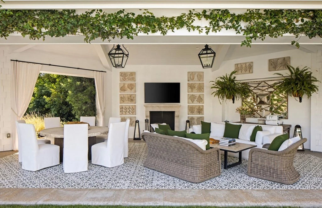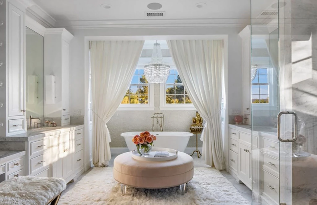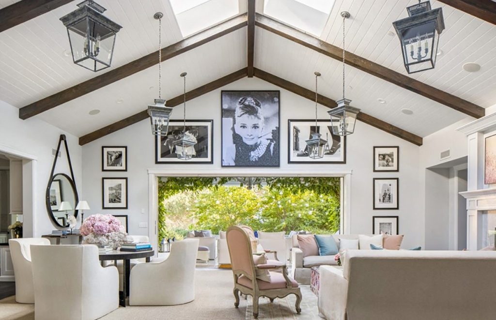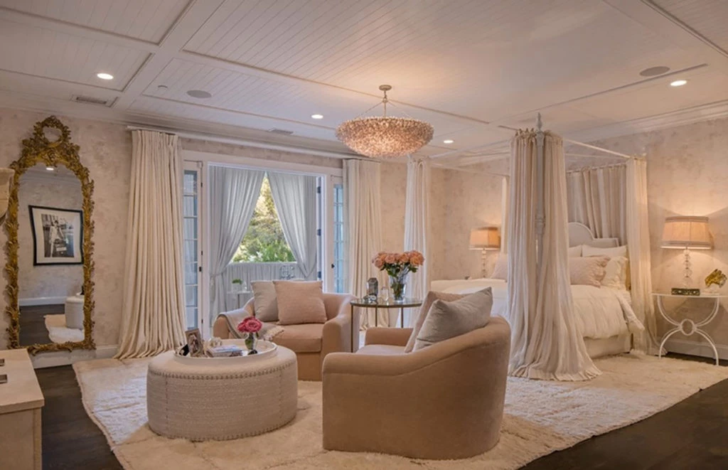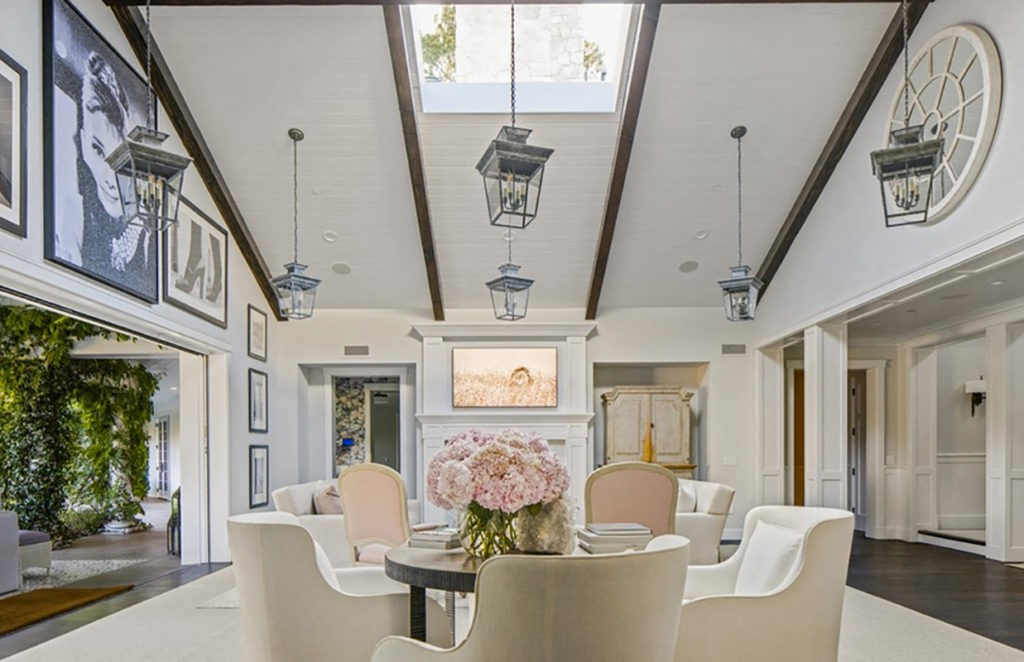El interior de la casa sigue un estilo de decoración contemporáneo, con techos abovedados con vigas, puertas Fleetwood y pisos de tablones anchos con acabado mate. Un dato curioso es que el anterior propietario la hizo decorar por el diseñador de interiores favorito de las Kardashian, Martyn Lawrence Bullard.