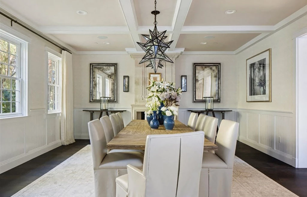El comedor principal tiene una mesa de madera robusta y espacio para ocho comensales. Los detalles sutiles en color negro -presentes en algunos objetos deco- le aportan una dosis extra de elegancia al espacio. Tres lámparas de diseño con forma de estrella sobrevuelan sobre este sector y llaman la atención a primera vista.