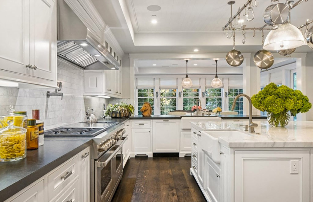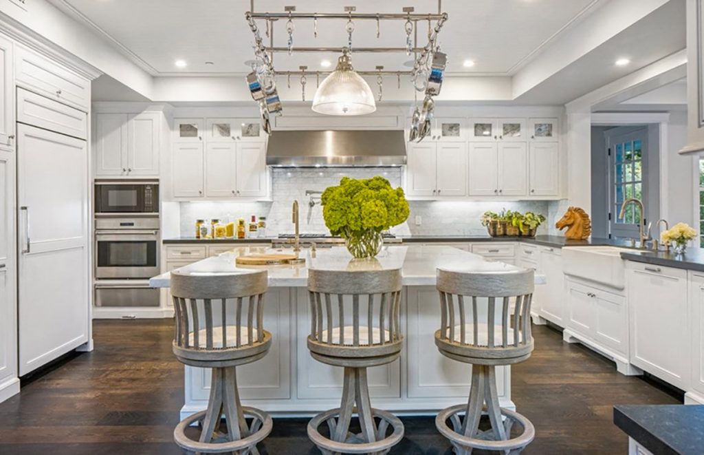Súper amplia, luminosa y en total white. Así es la cocina inspirada en una casa de campo que enamora a primera vista. Cuenta con múltiples espacios de guardado, mesadas de piedra negra, una súper isla con tapa de mármol blanco y banquetas, electrodomésticos de acero inoxidable de primer nivel empotrados en las paredes y griferías en oro mate.