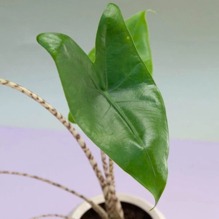Para que tengas una idea se trata de una especie con tallos finos y largos con una estampa similar al animal print, que culminan en grandes hojas de color verde con forma de punta de lanza. Una belleza súper exótica.
