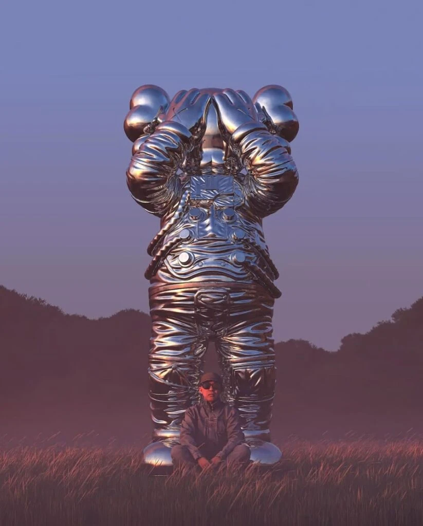 Parado al borde de la bahía… Así está la monumental estatua plateada de Kaws, artista que colabora habitualmente con Nigo, en el techo del Not a Hotel Tokio.