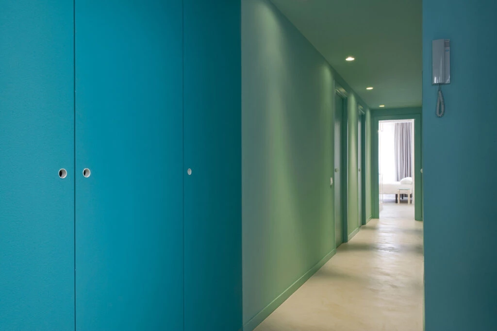 Una gran puerta giratoria de madera da acceso a la zona de noche. Cuando la puerta está cerrada, el color verde azulado de las paredes y el techo enmarcan la madera y a través del agujero blanco utilizado como tirador de la puerta.