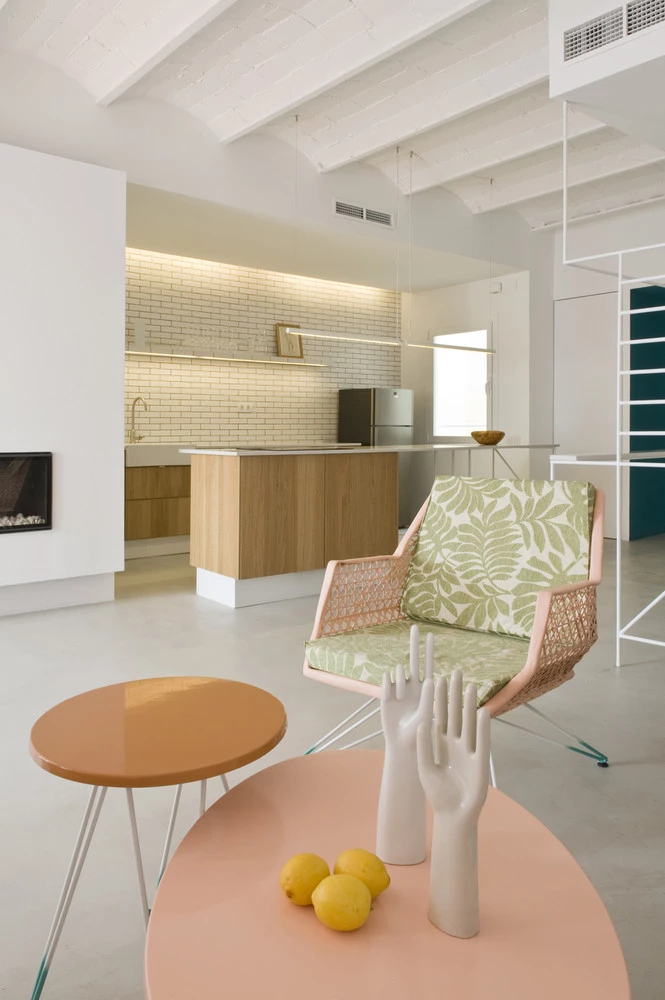La pared de la cocina tiene un acabado de azulejos de cerámica blanca mate que también cubren la repisa que se proyecta sobre la cocina. Esta repisa lleva una luz para iluminar la mesada. Tanto la superficie de la pared de azulejos y la repisa pasan desde la cocina a la barra, unificando visualmente las dos áreas. El volumen que las separa incorpora una chimenea de gas.