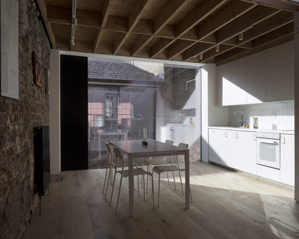 Esta antigua vivienda georgiana fue objeto de una extensa renovación para crear un hogar contemporáneo sostenible en el centro de la ciudad. La mayor parte fue destruida en un incendio en la década de 1980 y casi todas las características originales fueron erradicadas, dejando únicamente la fachada original y el muro medianero.