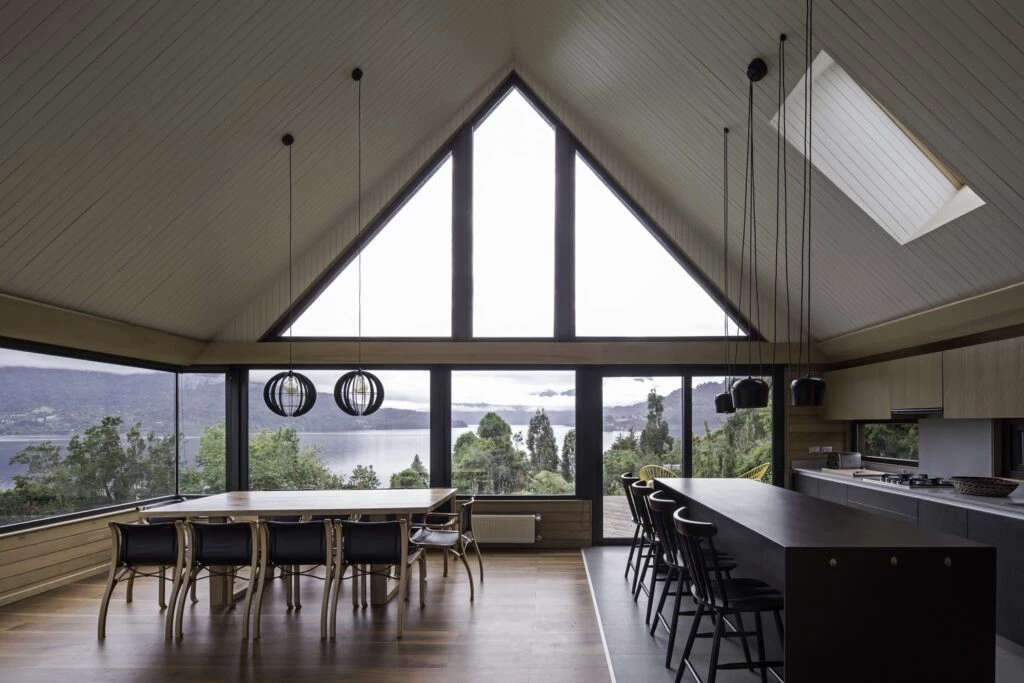 El volumen que enfrenta las mejores vistas tiene orientación oriente, y sus amplios ventanales enmarcan la hermosa vista al lago y cordillera, con salida a una terraza exterior que domina toda la vista.