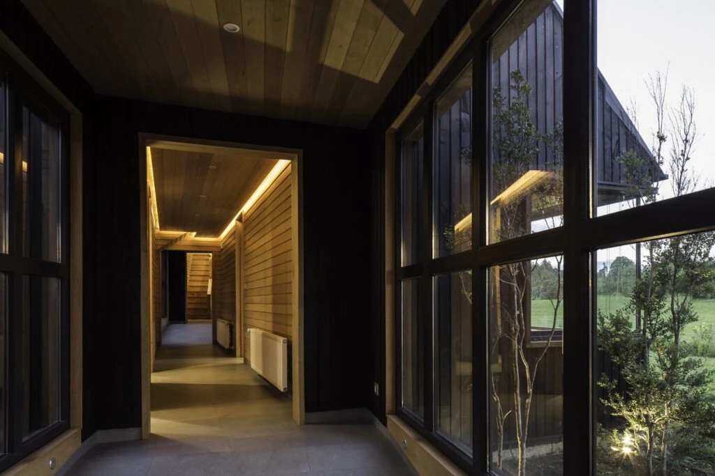 El exterior está protegido del norte con una barrera de árboles nativos (arrayanes) que dan cobijo y permiten mantener en todo momento el contacto del habitante con la naturaleza.