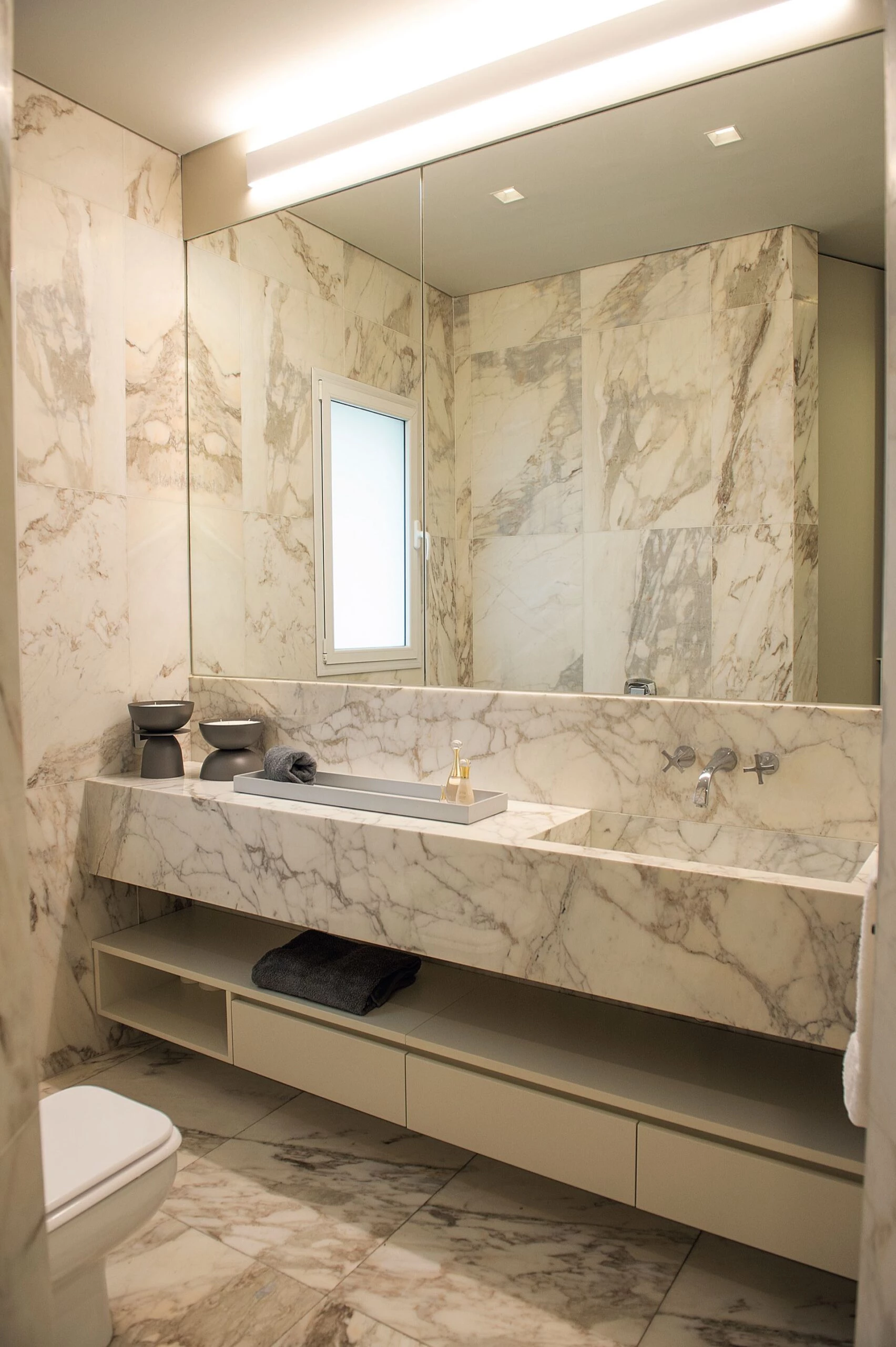 El baño principal, de diseño sintético y moderno, está revestido en su totalidad en mármol del tipo Calacatta con importantes dimensiones y espacios de guardado. Bandeja laqueada y set de candelabros geométricos de hierro esmaltado (Quintana Casa).