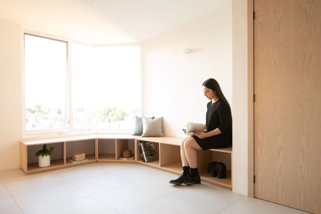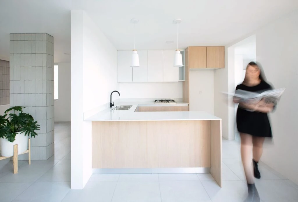 Con la idea de aprovechar esas vistas se generó un espacio de lectura y descanso con una banca de madera continua al ventanal, que también funciona como recibidor y antesala de la cocina, donde se convierte en articulador del área social.