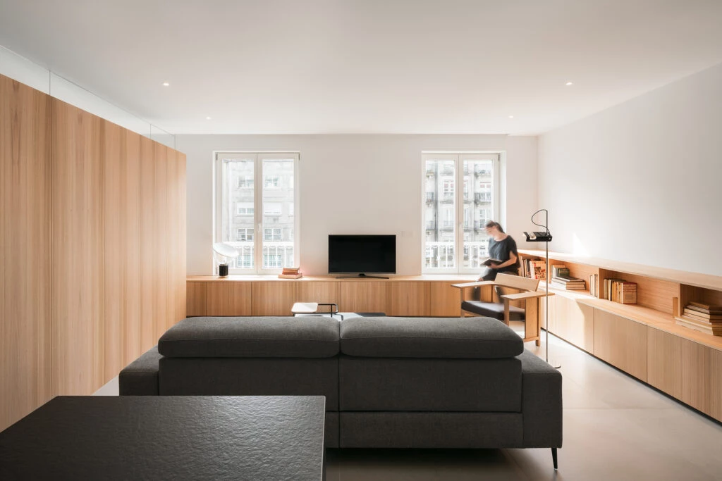 Ubicado en una zona céntrica de Vigo, España, este departamento de 100 m2 presentaba una disposición excesivamente compartimentada, que no se correspondía con las necesidades del nuevo dueño. Demasiados ambientes, muy ajustados en superficie y con una ventilación e iluminación pobres en aquellos espacios que no estaban alineados con la fachada.