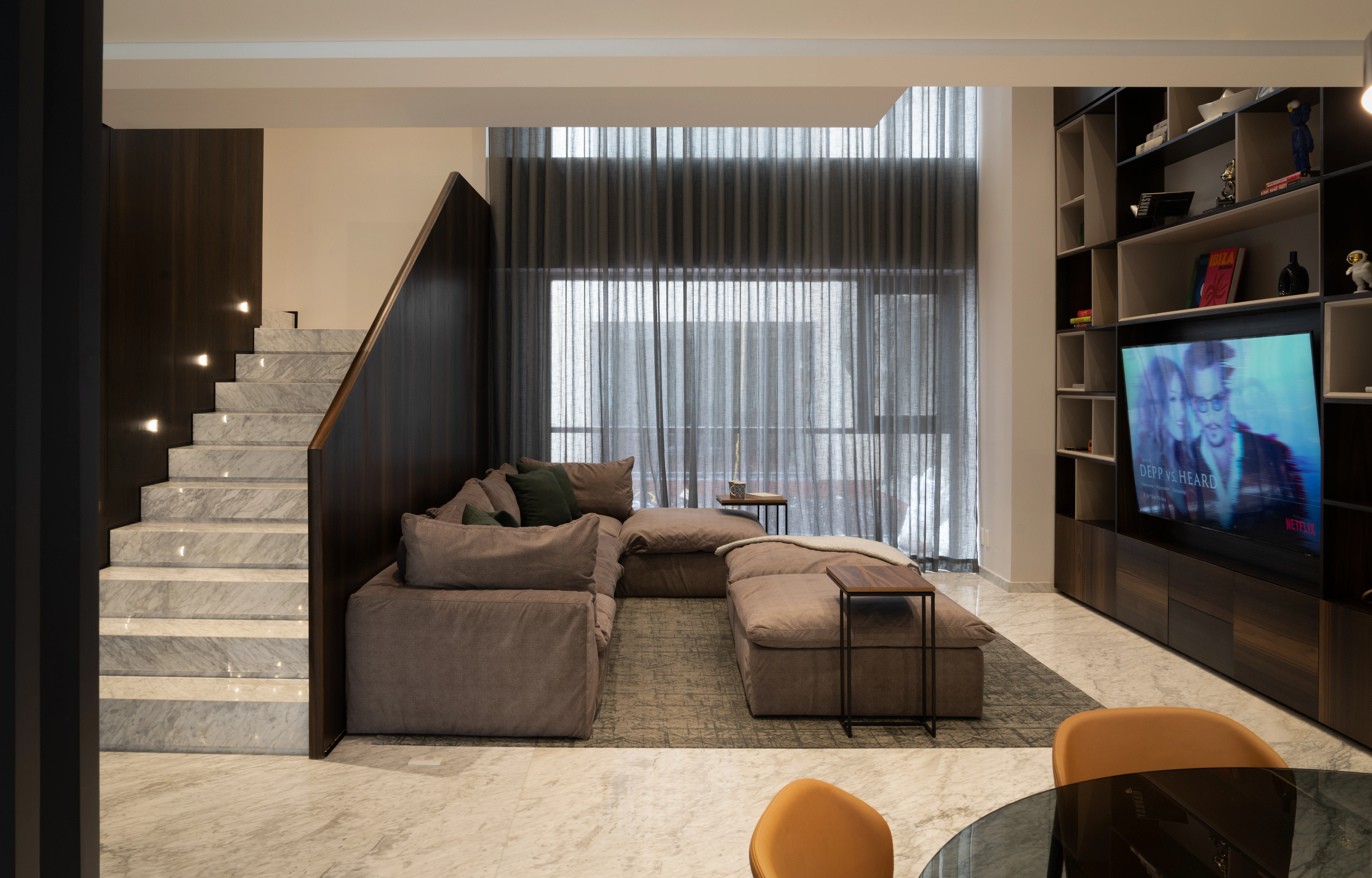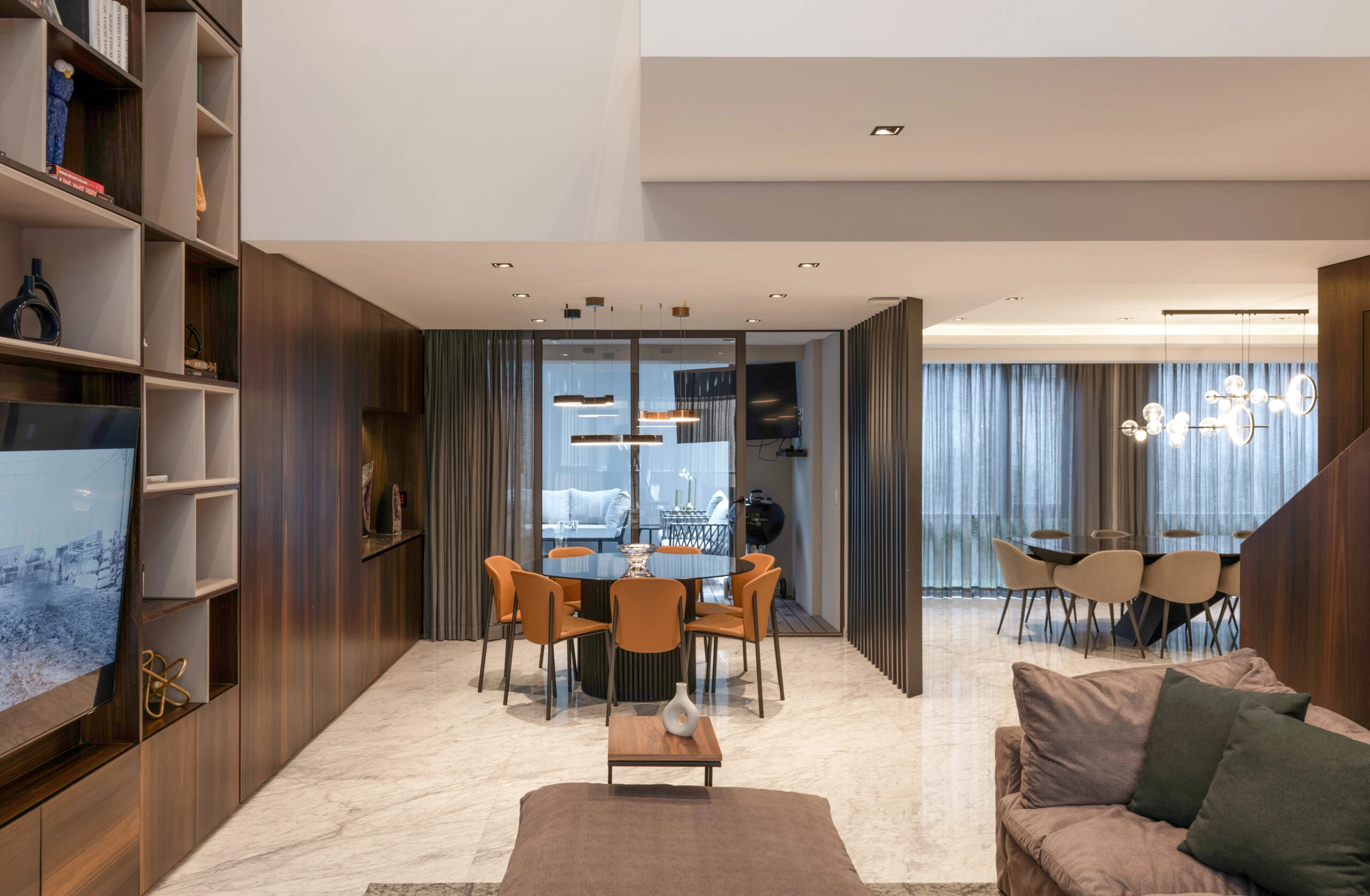 Caminando por los dos niveles de este magnífico departamento -donde la separación entre áreas comunes y privadas se desvanece sutilmente gracias a una escalera principal -que conecta pisos y espacios- nos sumergimos en una atmósfera donde lo contemporáneo se entrelaza con lo sereno, donde la funcionalidad abraza la tranquilidad.