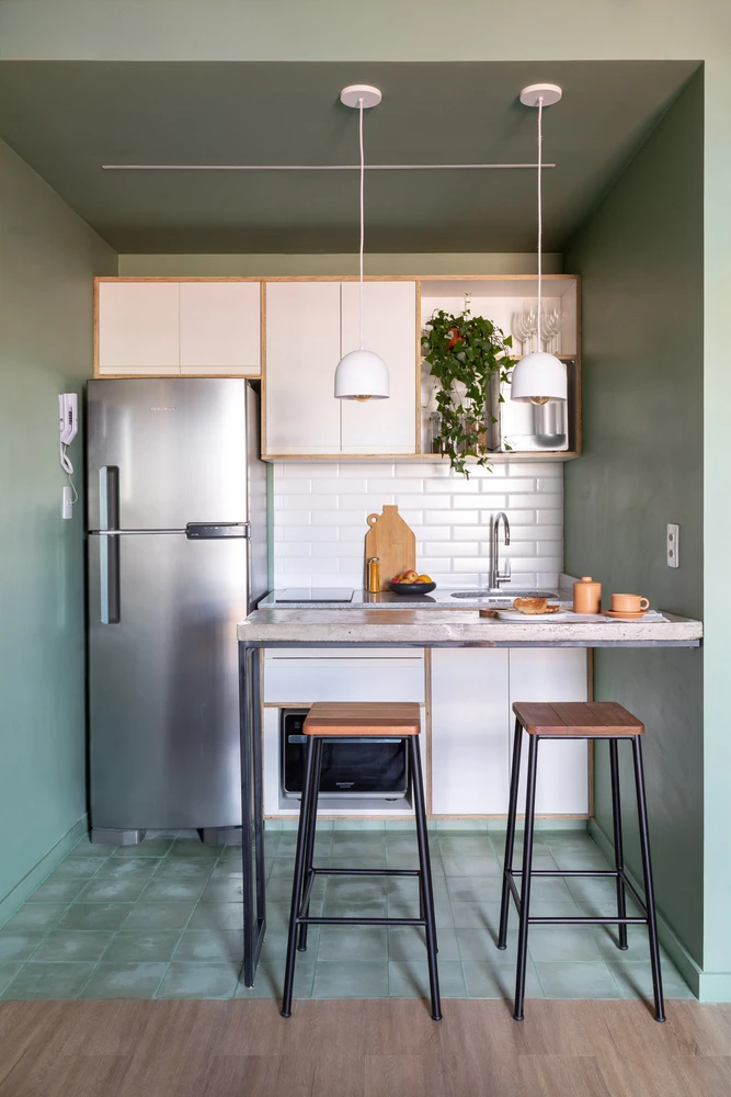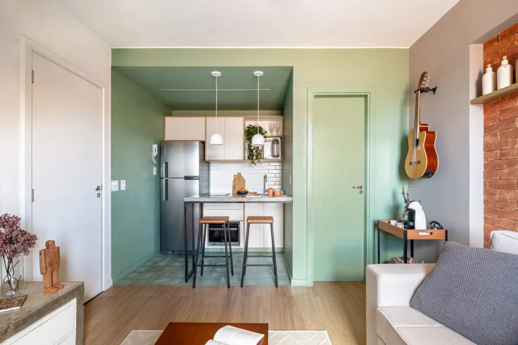 Lo más destacado del proyecto es la colorida cocina: se pintó el techo, la puerta y las paredes con un color verde grisáceo.