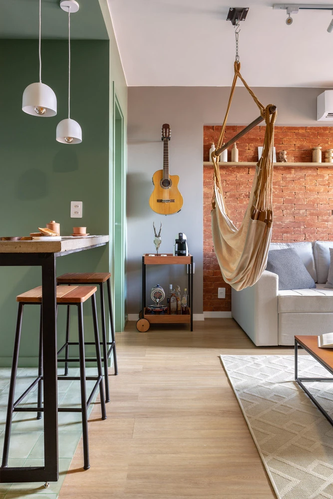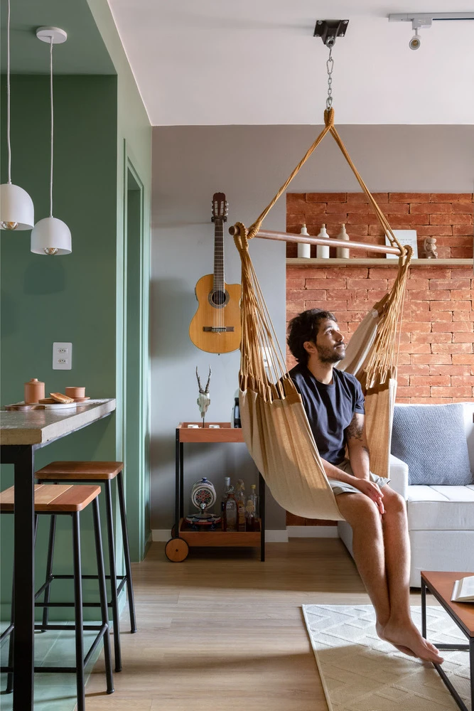 La primera demanda fue sumar una hamaca paraguaya en el living, ubicado en el piso inferior. El equipo a cargo sugirió ir por un modelo individual en forma de silla suspendida fijada en la losa, en el corazón del ambiente. Un sofá cómodo y compacto permite que el espacio se convierta en una habitación de invitados cuando sea necesario.