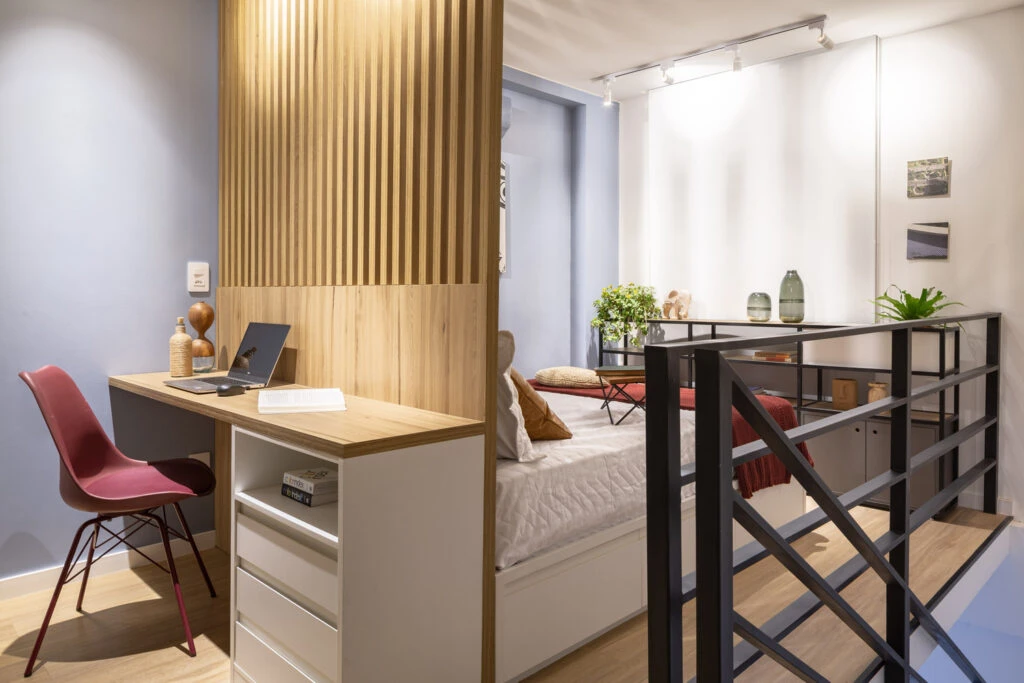 En el dormitorio se creó un panel transparente de madera para dividir la habitación con un espacio de oficina en casa, evitando una barrera visual pesada.