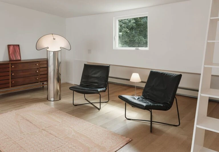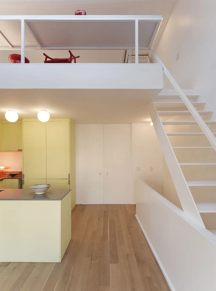 Frente a la escalera, una estantería se extiende verticalmente entre los espacios abiertos conectando los dos niveles.