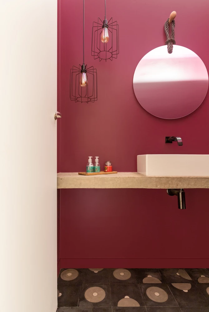 Durante la reconstrucción se diseñaron bancos de hormigón visto, tanto en el living como en el toilette, que recibió una pintura en color morado "açaí" que contrasta con el piso negro, gris y blanco.
