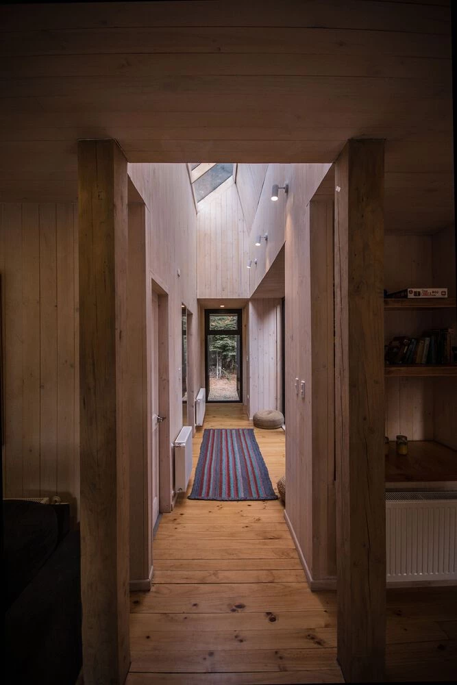 Por la humedad de la zona debido a la nieve que cae en inverno de más de 80 cm de altura, la estructura de llegada a suelo natural fue diseñada a partir de una estructura de piso de acero. Y luego de ahí paredes y cubierta completamente en madera.